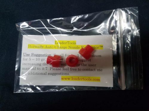 These are my Hornady Auto Charge Nozzle Restrictors, the set comes with small, medium and large. With these and my instructions I provide you will virtually eliminate overcharges and also may get a decent peformance boost taking less time overall to dispense charges.  (Tested with up to 40gr and have seen performance boost)